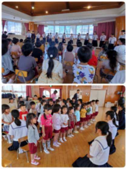 大淀中学校の合唱部の皆さんが幼稚園に来てくださり、たくさんの歌を聴かせてくれたり、一緒に歌ったりしました。