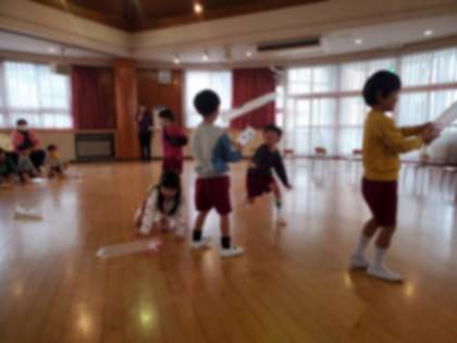 きりん組は傘袋でつくったロケットをプレゼントしたり、「世界中の子どもたちが」の歌をうたったりしました。