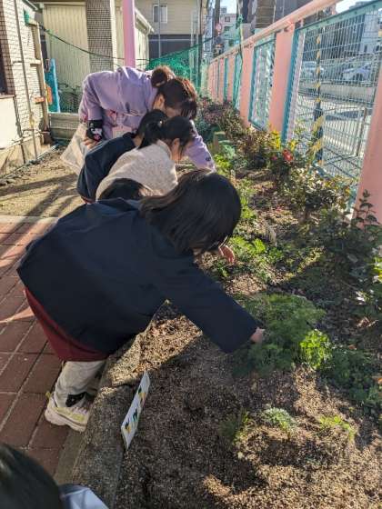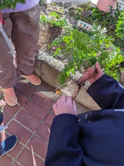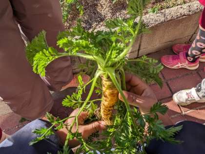 幼稚園の畑で、カラフル人参を預り保育の子ども達と収穫しました。形も色もいろんな人参を収穫する事ができました。「これって人参?」「どんな味がするのかな〜?」と不思議そうに言っている子どもがいました!