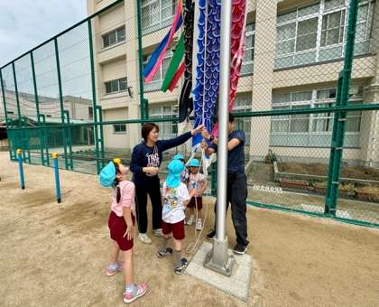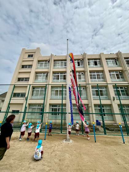 5歳児が大淀小学校の校庭に、こいのぼりをあげました!思わず、子どもたちが「やねよ〜り〜た〜か〜い こいの〜ぼ〜り〜!」と口ずさんでしまうほど、高くあがりました!気持ちよさそうに泳いでいましたね(^_^)