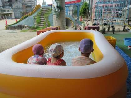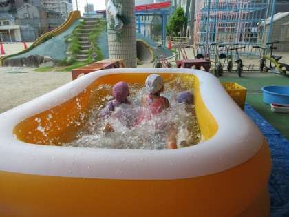 午前中は小さなプール三昧!! 隣でスーパーボールすくいや泡遊びを楽しむ子どもたちもいます♪