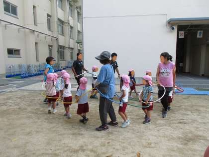 今回は、フープを使った遊びやかけっこ『よーい、ドン!』で遊びました。