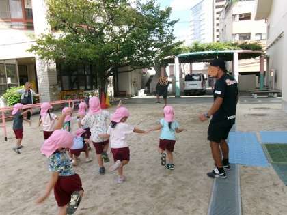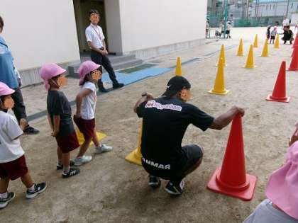 フープをくるくる回したり、ロケットジャンプや遠くまで転がしたり…いつの間にかなが〜い電車にも変身しました(*^_^*)コーチに「運動会もがんばってね!」とがんばれパワーももらいました!!