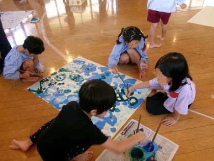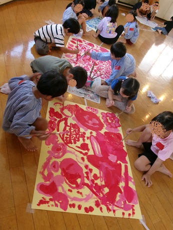 1年1組と4つのチームに分かれて、絵の具やクレパスを用いて遊びました。1組の当番の友達の号令に合わせて、授業が始まる時の挨拶も教えてもらいました。