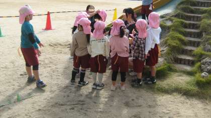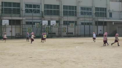 今日も、しっぽとりをして広い運動場を駆け抜けています。