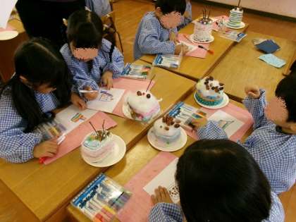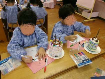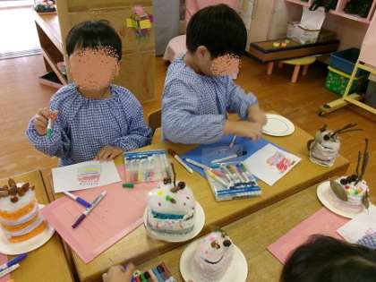 今日は、自分がつくったケーキのメニュー表づくりをしています🍰「わたしのケーキはいちごいっぱい」「ぼくのケーキは、589円!」「わたしのケーキ、もっと高いで!」…みんなでケーキ屋さんの話をしながらメニュー表づくりを楽しみました♪