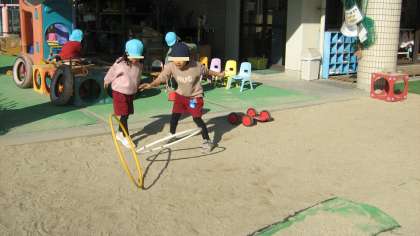 大きな輪を回して遊んでいる子がいたところ、いっしょにやろうといって遊び始めました。