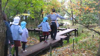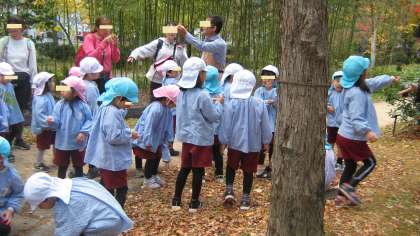 おいもほりをするまえに、里山の野菜クイズをしたり、葉っぱのにおいを確かめてみたり、一本道を歩いたりしました。