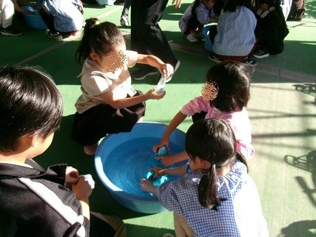 石鹸の付け方やこすり洗い、すすぎ洗い、絞って干すところまで教えてくれました(^^)/ 1年生は、『おうちのお手伝いをしよう!』という授業で、上靴洗いを教わったそうです。