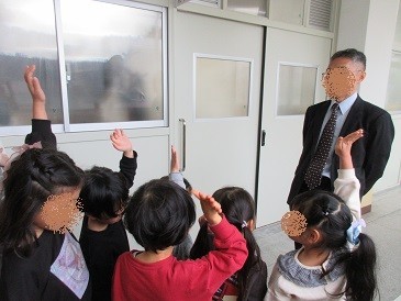 緊急放送をよく聞き、小学校の校舎まで周囲に気を付けながら、避難することができました。がんばった姿を園長先生や小学校の教頭先生に褒めていただきました。冬休み中も安全に気を付けて過ごしましょう!