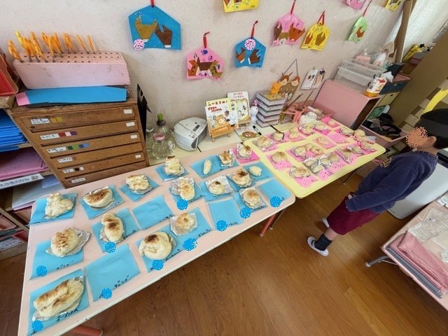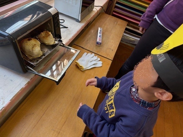 「おっきくなってる」「食べたいなあ」「〇〇ちゃんのパン、すごい!おいしそう」と焼き上がったパンを見て、嬉しそうに話してくれました。