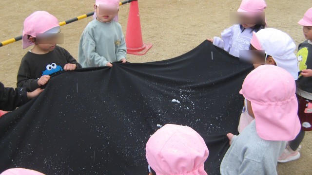 お弁当を食べた後、外遊びをしている雪が降ってきました。