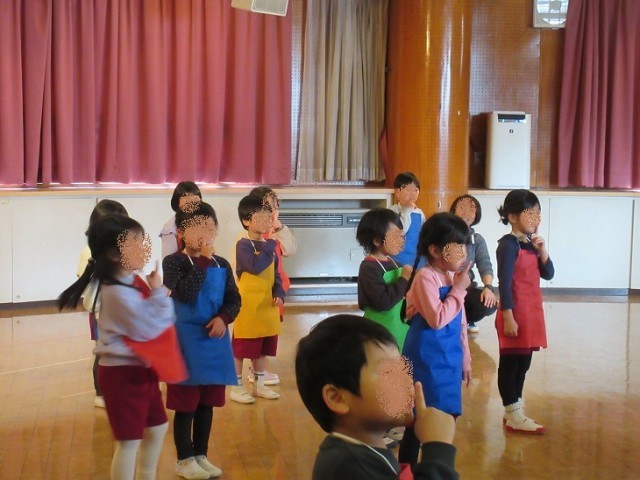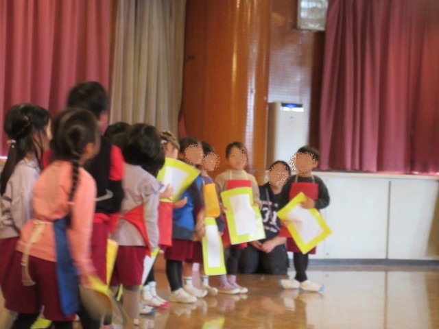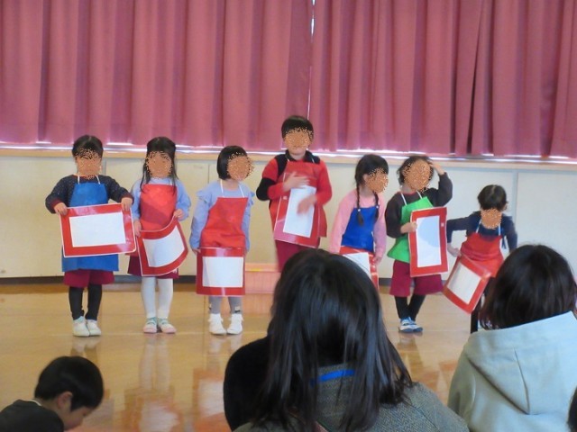 お店屋さんに変身した子どもたちは、いろいろな品物をお店に並べていきました♪やおやさん、くだものやさん、おかしやさんに置いてある品物には『あるある!』。置いていない品物には『ないない!』と元気に答えます。