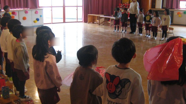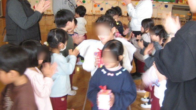 花道を歩いていくきりん組さん。ありがとうといってうさぎ組さんに行ってプレイルームを離れていきました。