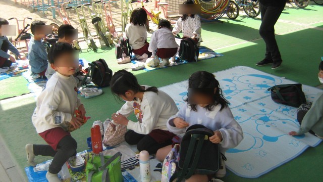 きりん組さんはシートを敷いて外でお弁当をいただきました。