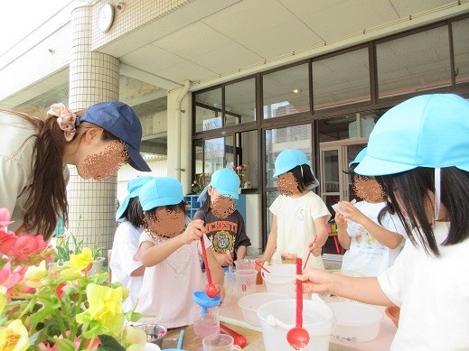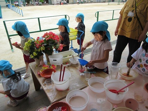 ベゴニアの花びらを使った色水ジュースづくりが始まりました。