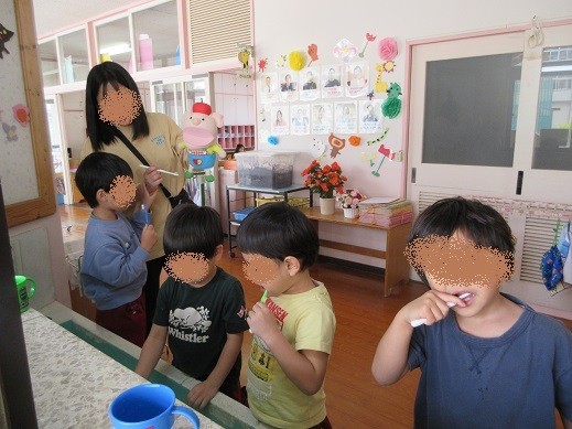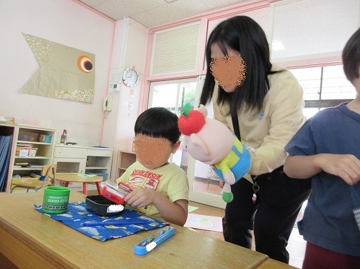 4歳児がお弁当を食べた後に、はみがきぶーちゃんがやってきました。