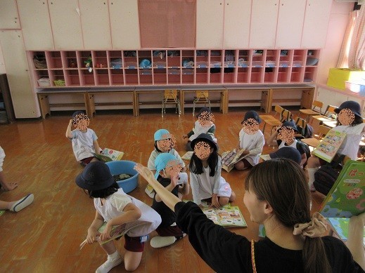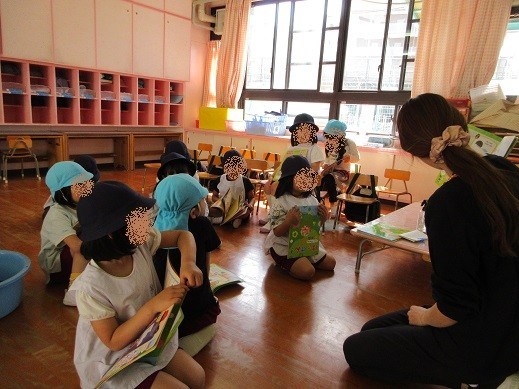 月刊絵本を使って、ダンゴムシクイズを楽しむ5歳児。