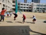 うさぎ組の子どもが大縄跳びに挑戦して遊んでいました。3人で気持ちを合わせて6回跳...