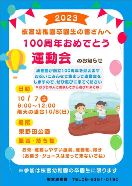 2023年10月7日(土)に桜宮幼稚園100周年おめでとう運動会をします。