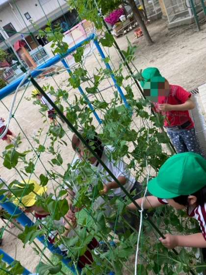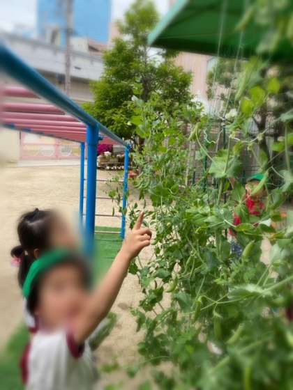 子どもたちは「どれにしよかな…」とようく選んで、高いところにあるスナップエンドウを指差し「先生、あれが欲しいねん」「あれ取って」と言います。