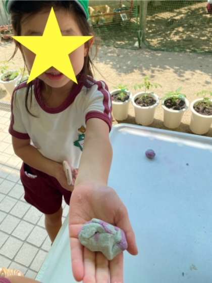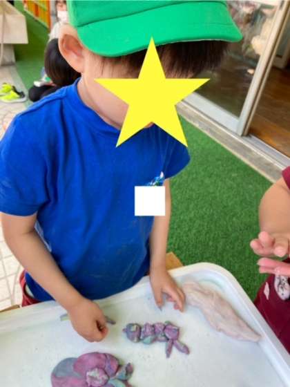 5歳児緑組は、先日から、小麦粉粘土に自分の好きな色をつけて遊んでいました。赤や青、黄色…