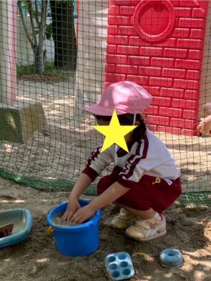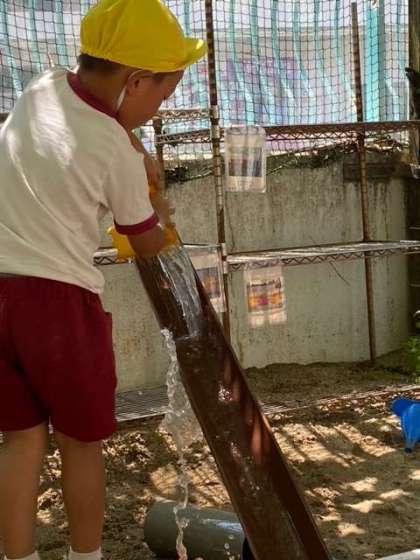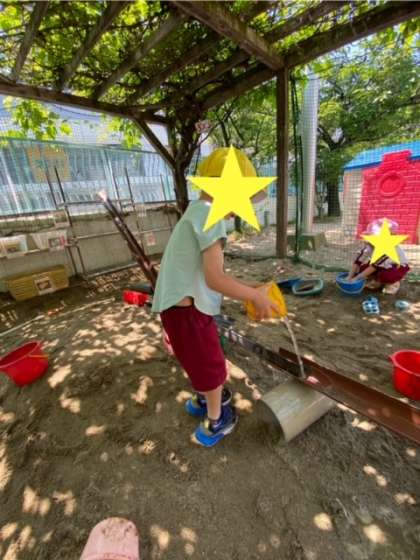 砂場では、バケツに砂と水を入れて、両方の手の平でペチャペチャ感触を楽しんだり、トイをつなげて水を流したりして遊んでいました。