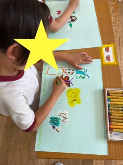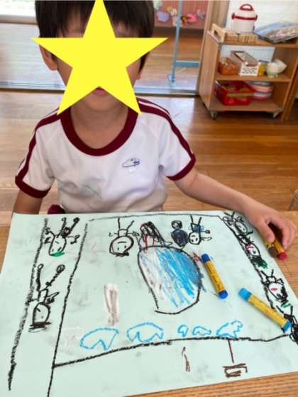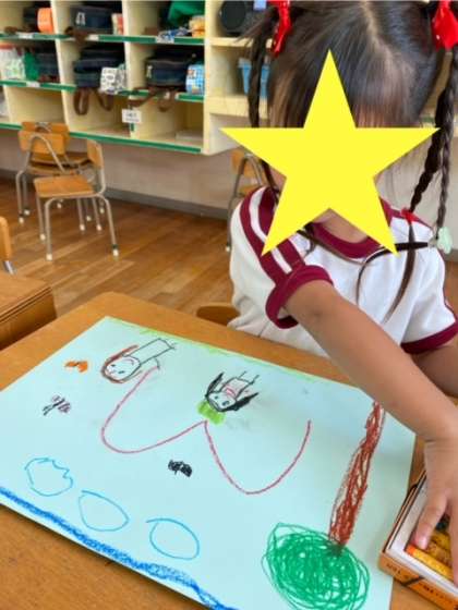「ツマグロヒョウモン(チョウチョ)を見つけたよ」「忍者になって抜き足、差し足って言って歩いてるところ」「縄跳び跳んでるねん」経験したことが手に取るように分かる楽しい絵でした。