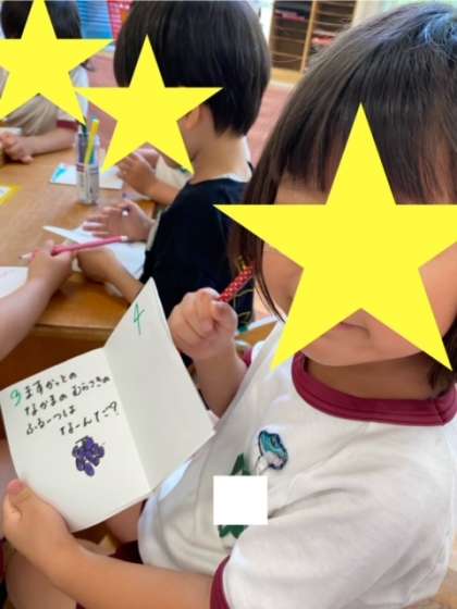 「あまくて、あかくて、まるいくだものはなーんだ?」など、クイズを考えてから答えの絵をかく子ども、絵をかいてからクイズを考えて文字を書く(書いてもらう)子ども…様々ですが、自分で考えて書き、それが本になることが楽しくて仕方がない様子でした。