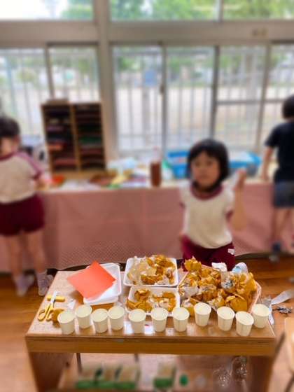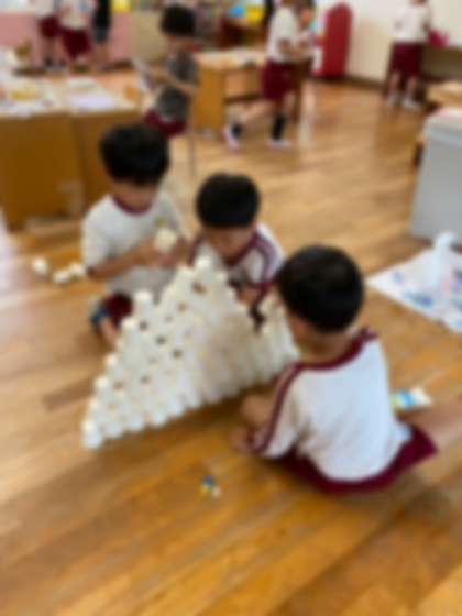 5歳児緑組では、紙コップを夢中になって積んで遊んでいます…