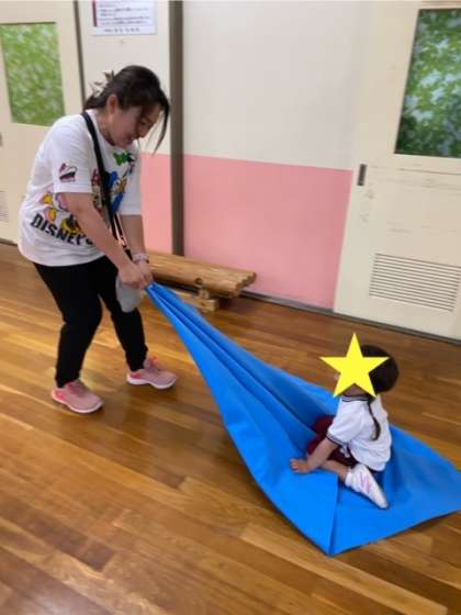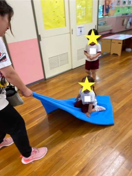 火曜日。今日も雨。しかも大雨です…でも、子どもたちは保育室で昨日の遊びの続きを楽しんでいます。3歳児もも組合は、魔法の絨毯に乗って空のお散歩。