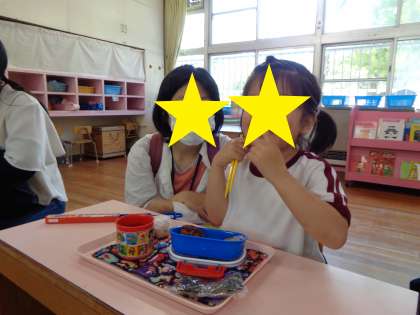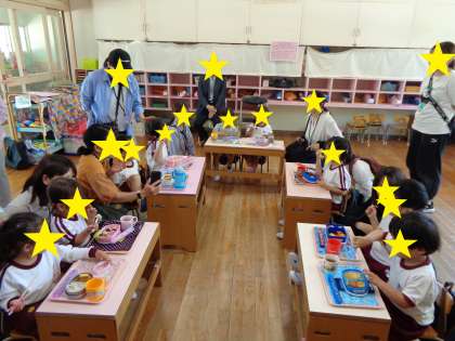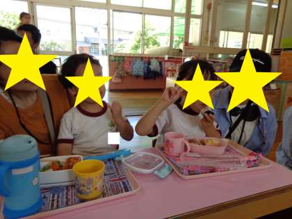 弁当参観(3歳児もも組) 公開日 2024/06/05 更新日 2024/06/05 幼稚園日記 3歳児もも組の弁当参観でした。 お家の人が間近で見てくださっているので、子どもたちはいつもより張り切ってパクパクモグモグ食べていました。 友達と一緒に楽しく食べることを第1にしながら、姿勢を正しく食べられるように知らせたり、フォークやスプーンからお箸へ移行できるように保護者と連携したり、少しずつでもお野菜を食べられるように励ましたりするなどしています。 いいね(0)