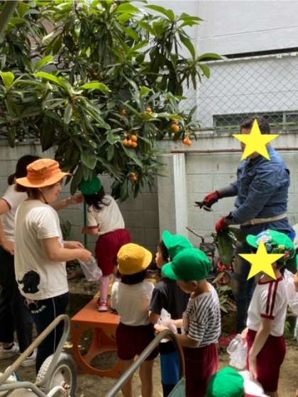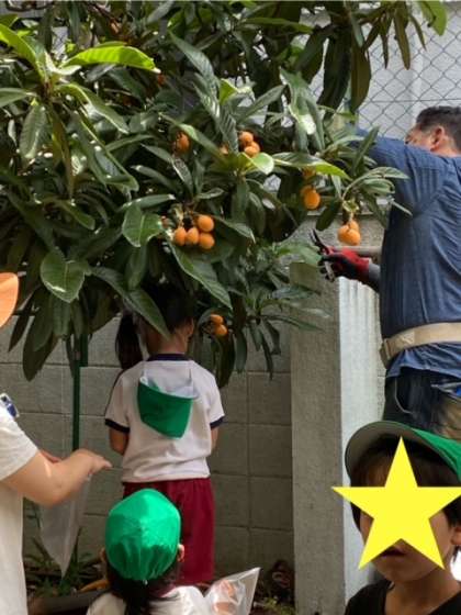 幼稚園にビワが実り、事業担当主事さんと一緒に収穫しました。