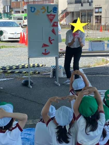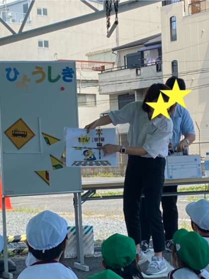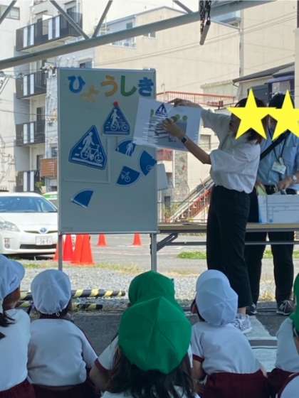 いろいろな道路標識を、パズルで正しく組み合わせられていたら、腕で「◯(丸)」を作って知らせます。道路標識の意味を楽しみながら教えてもらいました。