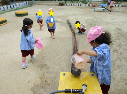 今日はお水を山の上までせっせと運び、樋にお水を流して遊んでいました。「来た!来た!」と水が流れて来るのを楽しんでいる子ども、何度も何度も水を運んで来てを水を流すのを楽しんでいる子ども、しばらくすると大きな水たまりができて・・・