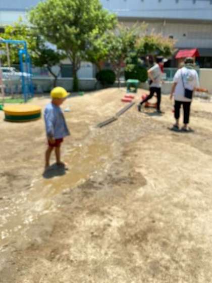 真夏のように暑い日差しのもと、園庭ではどろんこ遊びがブームです。