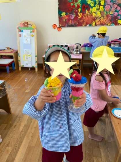 透明の容器にいろいろな色の紙粘土を詰め込んで「パフェつくったよ」