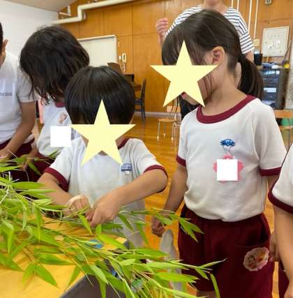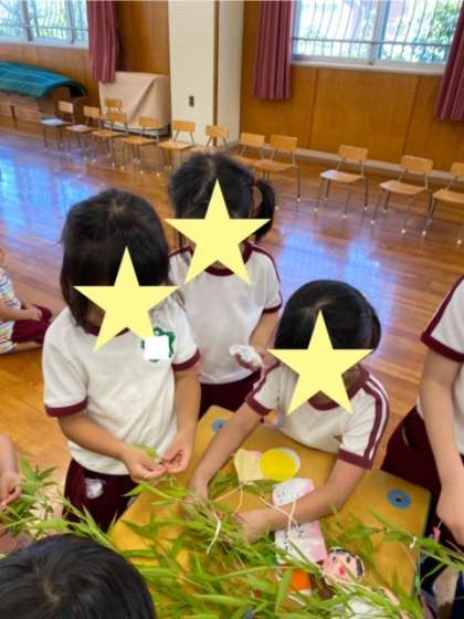 笹飾り2 公開日 2024/07/06 更新日 2024/07/06 幼稚園日記 3歳児桃組の飾りつけは、5歳児緑組がお手伝いをしてくれました。「こより、結んであげる」と頼もしいお兄さんお姉さんの姿を、桃組さんがジッと見つめていました。緑組さん、ありがとう! いいね(0)