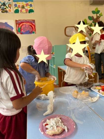 研究保育3 公開日 2024/07/10 更新日 2024/07/10 幼稚園日記 色画用紙でつくった紙粘土で、カラフルなケーキやデザートをつくりました。 市販の紙粘土に水を混ぜ、クリーム絞りで絞って、本物のようなデザートができていました。 いいね(0)