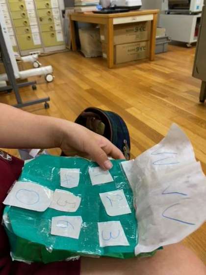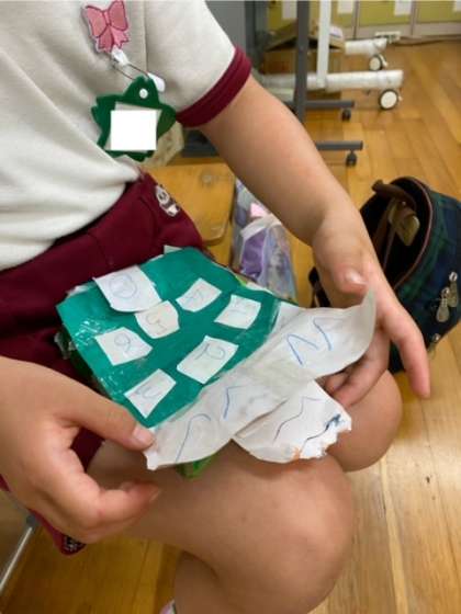 今朝、5歳児緑組の子どもが、お家でつくったものを持って職員室にやって来ました。