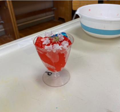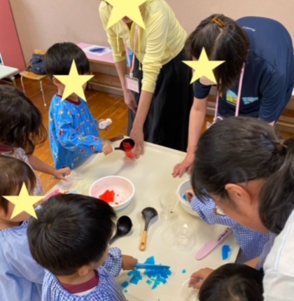 3歳児もも組は、色鮮やかな赤と青の寒天で、地域の方と一緒に遊んでもらってご機嫌でした。おいしそうなデザートのできあがり!!