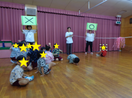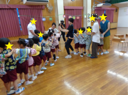 夕涼み会1 公開日 2024/07/19 更新日 2024/07/19 幼稚園日記 5歳児緑組の夕涼み会。 夜に幼稚園に来るなんて、なんだか不思議な気分・・・子どもたちは、いつもよりテンションが高めです。 ○×クイズでは、幼稚園にいるウサギやキンギョの名前を当てたり、担任の先生が、朝、食べた物を当てたりしました。正解を聞く度に大盛り上がりでした。 キャンプファイヤーは主事さんがつくってくれたものです。本物みたいでしたね。 ジャンケン汽車は、大人も一緒にしました。楽しい声が響きました。 いいね(0)