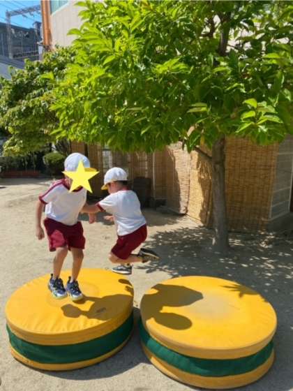 4歳児黄組は、トランポリンでピョーンと跳びながら場所を交代していました。お見事!!