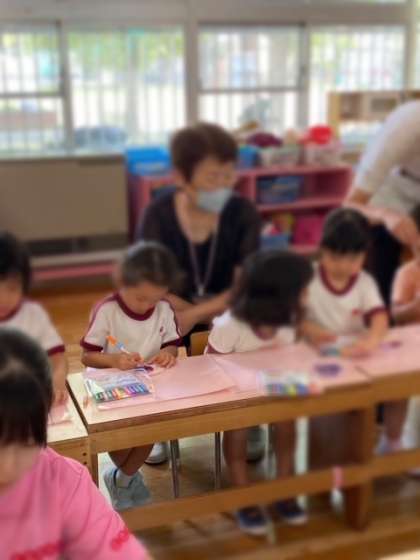 3歳児桃組は、染め紙に絵をかきました。これを先生がラミネートしてコースターにしてくれます。