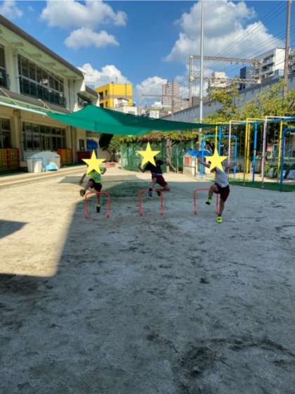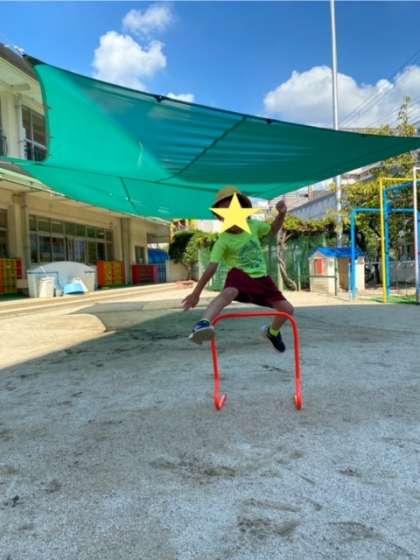園庭開放では、先日の遊ぼうデーで地域の方が持って来てくださったハードルを跳び越えて遊んでいました。