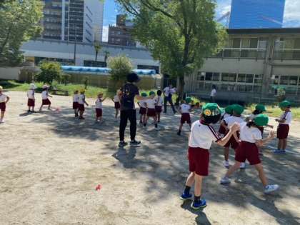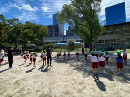 気持ちのよい青空の下、東野田公園で、オリンピア体操とみやっこ体操をしましたよ。