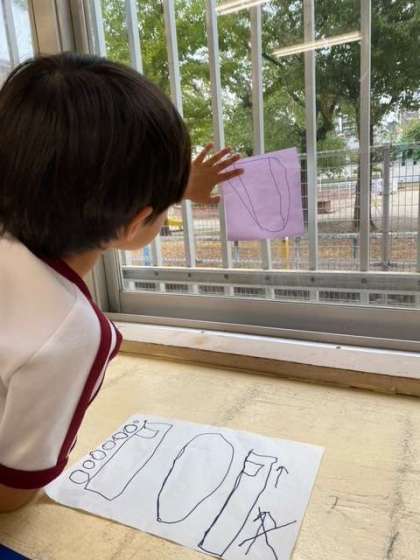 嬉しそうに「先生、ちょっとこっちに来て」と手を引かれて行ってみると、窓に何やら貼ってあります。「これはな、新幹線の前のところやねん」