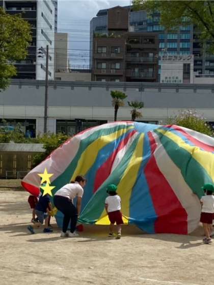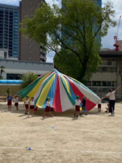 風が強くてパラバルーンが飛ばされそうになっていましたが、指先に力を入れて大きく膨らませたり、メリーゴーランドをしたりしていました。
