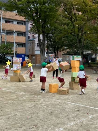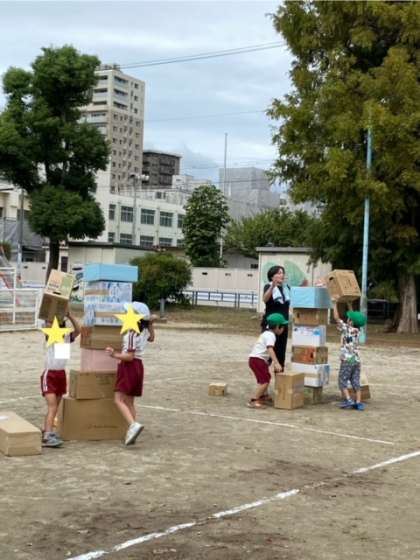 5歳児緑組は、段ボールを積んで高さを競います。