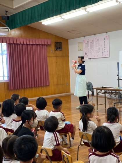 ペープサートやエプロンシアターなどを使って、虫歯菌の話を聞いたり、歯の磨き方を教えてもらったりしました。目で見て分かるよう工夫されていて、子どもたちは熱心に話を聞いたり、歯ブラシで歯を磨いたりしていました。